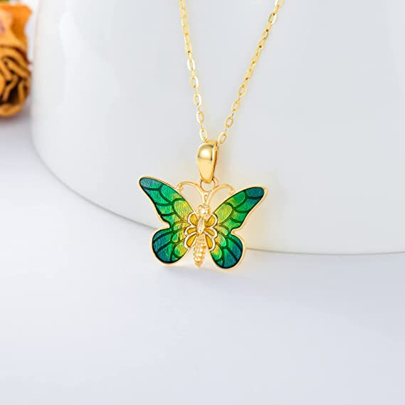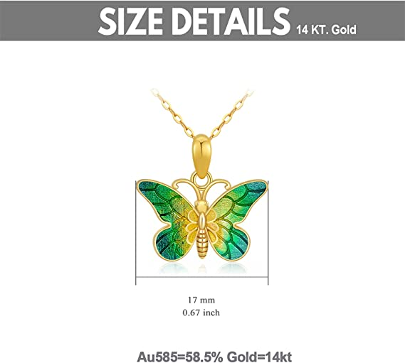 • ?【DESIGN AND QUALITY】This beautiful 14K women gold butterfly Pendant Necklace is made of the finest metal and has a high degree of polish. The stylish and elegant design of this necklace is absolutely impeccable.Metal: 58.5% pure gold (in 14k real gold, not just a covering). These 14k necklace for women girls are high-quality and Nickel Free.